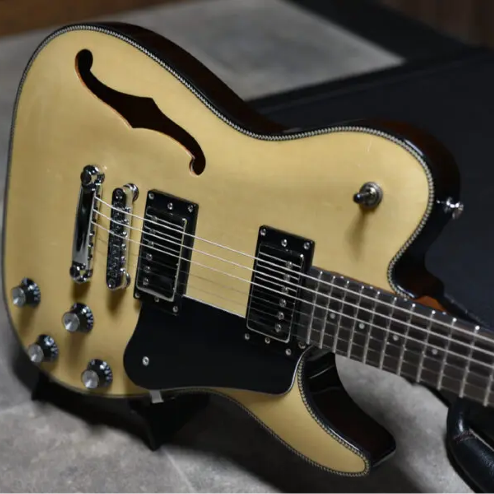 מבנה גוף סמי‑הולו עם פתחת F‑hole – שילוב בין חמימות אקוסטית לבהירות חשמלית.
