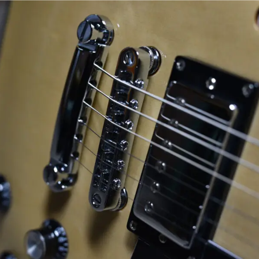 הגשר מסוג Tune‑O‑Matic ותותב ה־Graphtech® TUSQ XL מבטיחים יציבות כיוון ואיזון בין חום אקוסטי לעוצמה חשמלית.